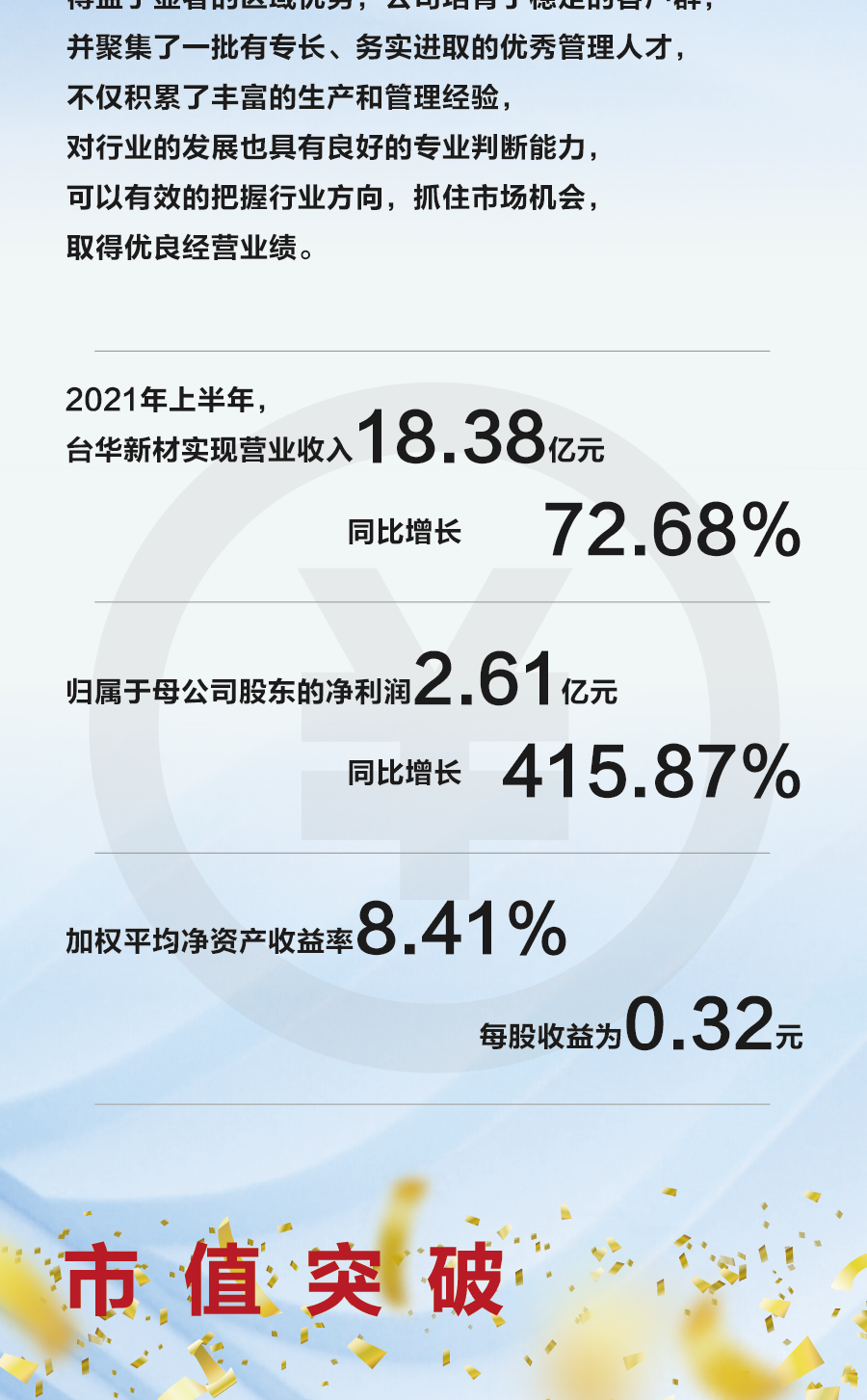 2021年上半年,臺華新材實現(xiàn)營業(yè)收入18.38億元,同比增長72.68%。歸屬于母公司股東的凈利潤2.61億元,同比增長415.87%,加權平均凈資產收益率8.41%,每股收益為0.32元。市值突破100億元!
