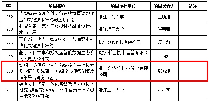 2023年12月18日,浙江省科學技術廳發(fā)布了《關于2024年度“尖兵”“領雁”研發(fā)攻關計劃項目立項的公示》,對608項擬立項的2024年度“尖兵”“領雁”研發(fā)攻關計劃項目(含省甬聯(lián)動項目)予以公示,浙江臺華新材料股份有限公司“紡織全流程數(shù)字孿生系統(tǒng)核心關鍵技術及軟硬件系統(tǒng)研制-紡織全流程智能調(diào)度決策平臺研發(fā)與應用”獲得浙江省2024年度“領雁”研發(fā)攻關計劃項目立項。