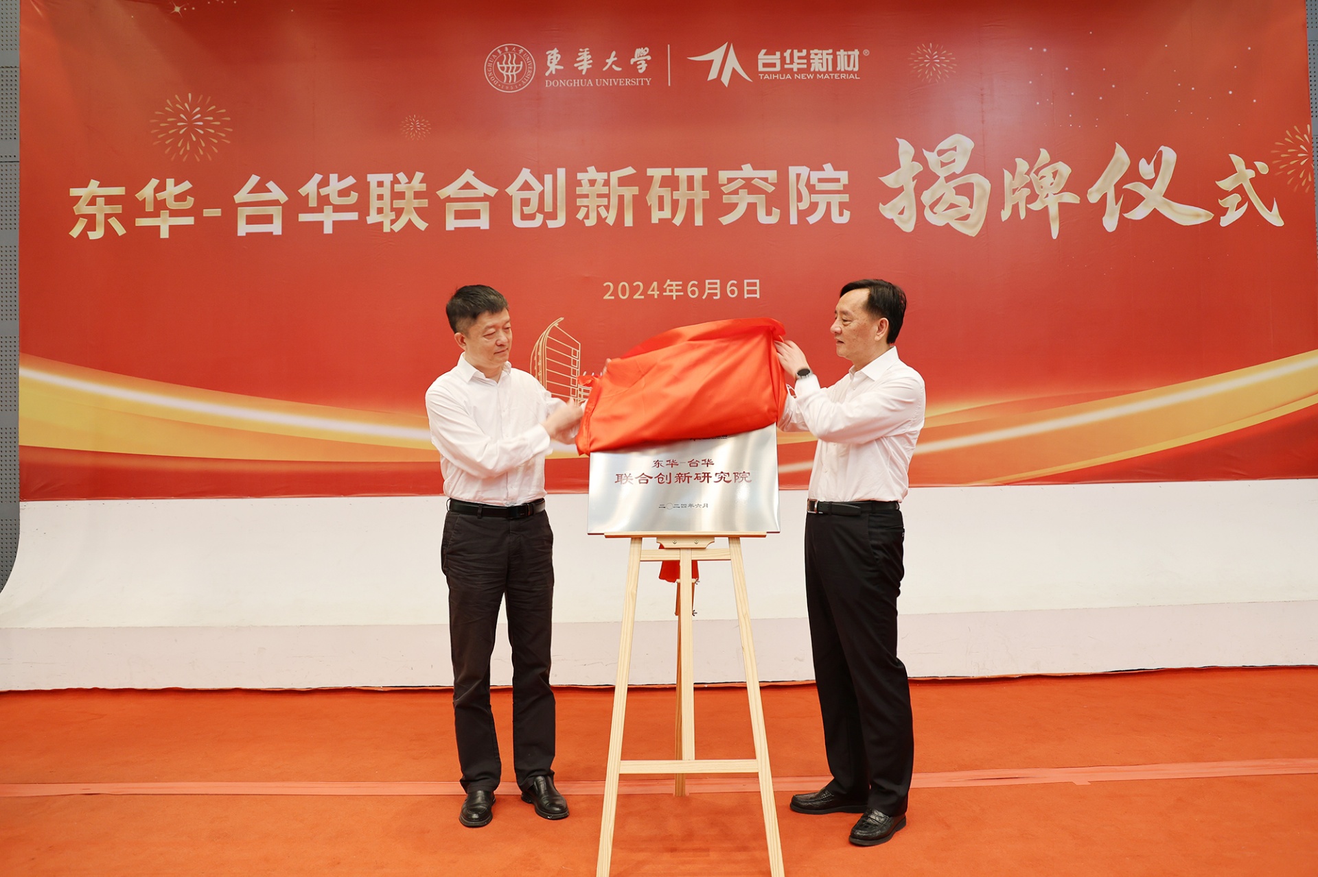 浙江臺(tái)華新材料集團(tuán)股份有限公司代表,東華大學(xué)相關(guān)部門負(fù)責(zé)人、院系代表見證“東華—臺(tái)華聯(lián)合創(chuàng)新研究院”揭牌。