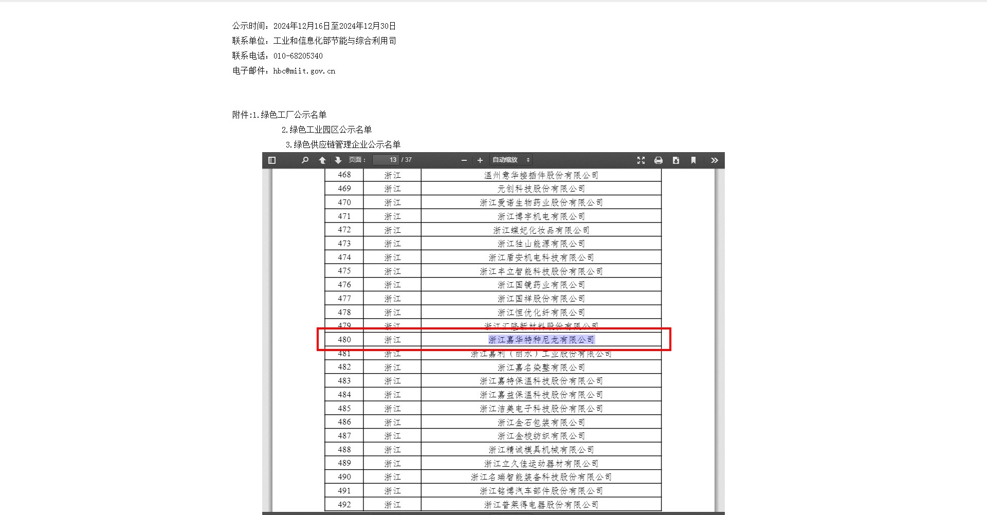 近日,工業(yè)和信息化部節(jié)能與綜合利用司發(fā)布《2024年度綠色制造名單公示》,集團(tuán)子公司浙江嘉華特種尼龍有限公司榮獲國家級綠色工廠,繼2022年1月浙江臺華新材料集團(tuán)股份有限公司榮獲國家級綠色工廠之后,集團(tuán)內(nèi)又一個子公司獲得此殊榮。