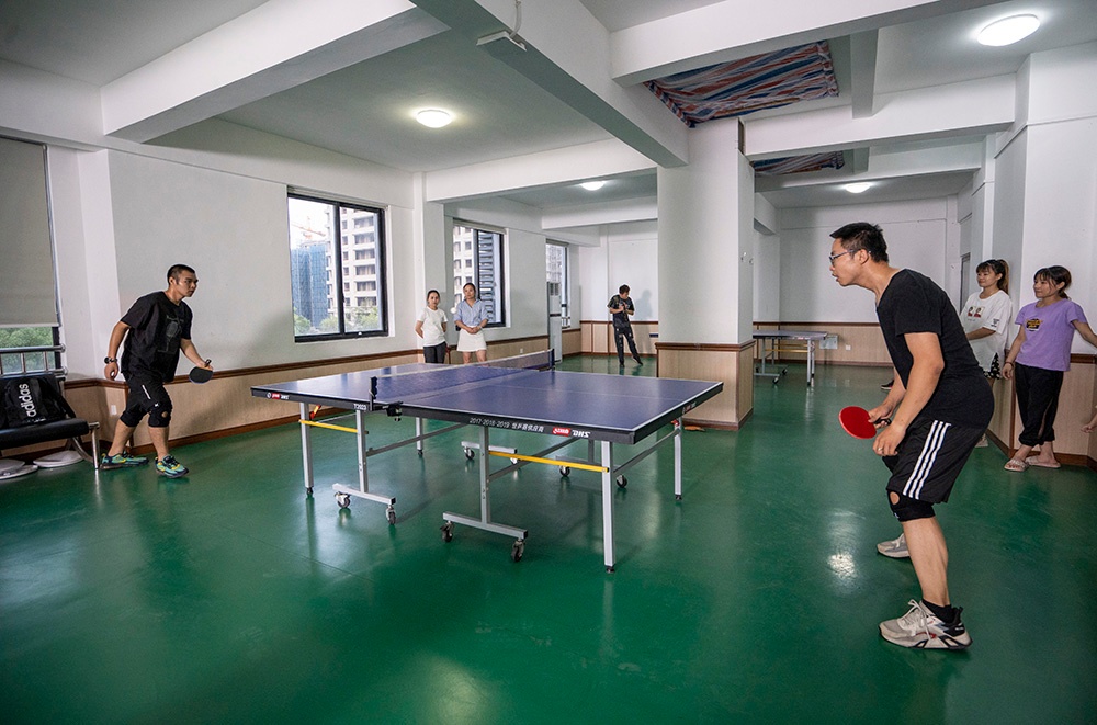 公司自建生活小區(qū),員工宿舍有套房(兩室一廳)、單人間以及集體宿舍等不同房型,房間內(nèi)設(shè)空調(diào)、熱水淋浴、衣柜、床鋪等設(shè)施,滿足員工基本需求。生活小區(qū)還提供閱覽室、籃球場、臺球室等,并緊鄰?fù)醯昝繁惫珗@,給臺華家人們提供不同的休閑方式。
