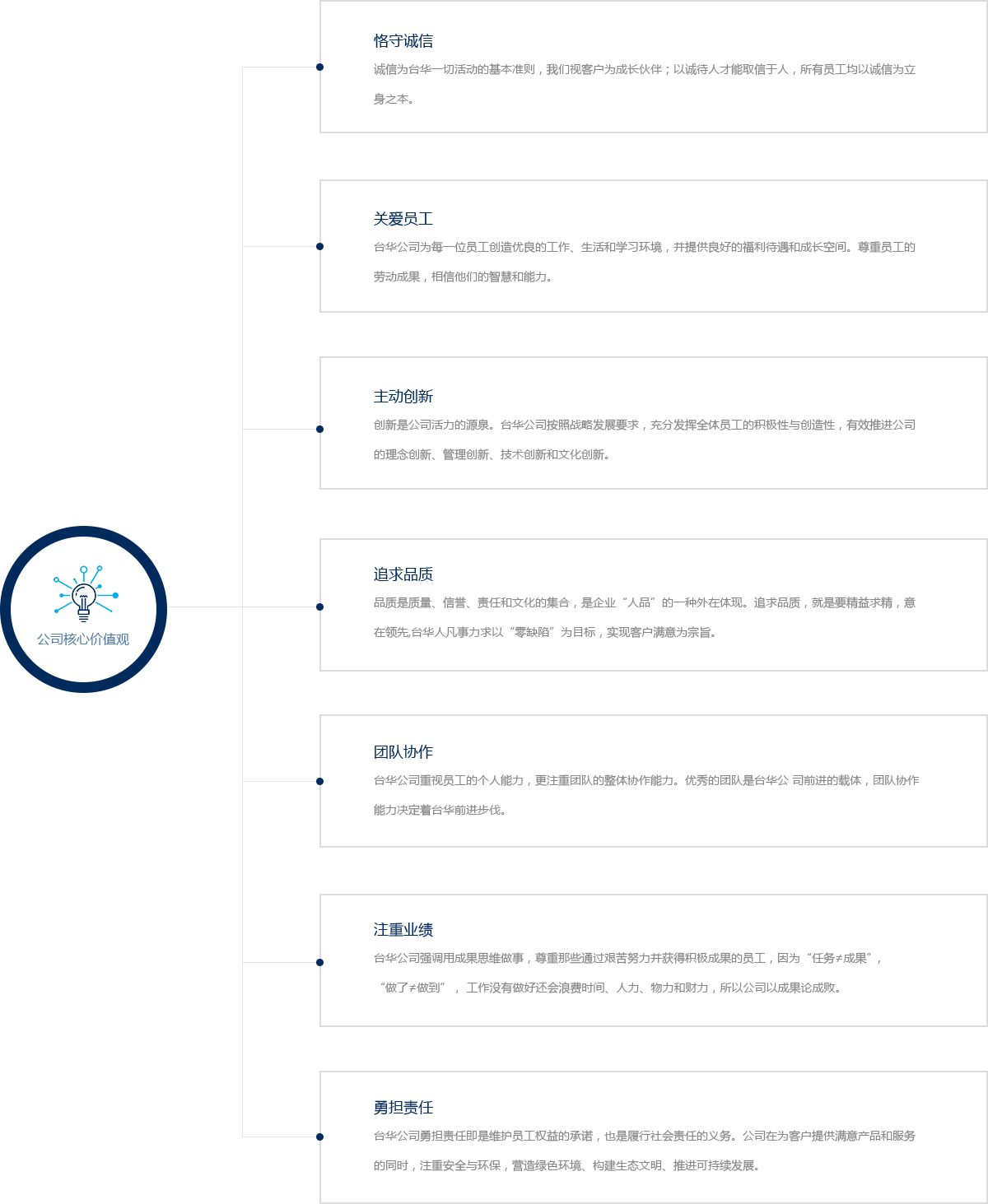 自2001年發(fā)展至今,臺(tái)華公司從小到大、從弱到強(qiáng),臺(tái)華人用辛勞的汗水曾澆灌出了“主動(dòng)、責(zé)任、紀(jì)律、團(tuán)結(jié)”的精 神之花。2014年,為了適應(yīng)公司新的發(fā)展要求,臺(tái)華人提出了新企業(yè)精神“盡職、高效、拼搏、和諧、創(chuàng)新”,并編入公司管 理制度及相關(guān)規(guī)范性文件。