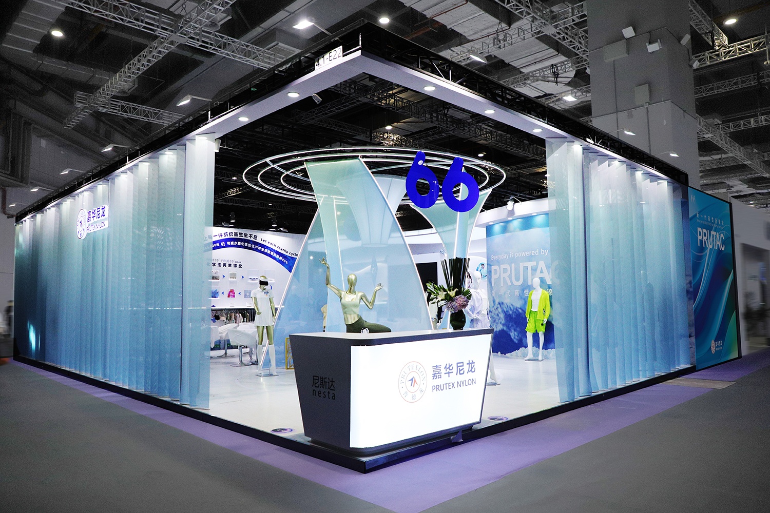 嘉華尼龍本次展臺(tái)以上古神獸-鳳凰的五彩羽毛為靈感,旨在通過絲縷重疊、通透玲瓏的展臺(tái),呈現(xiàn)如鳳羽般舒適、輕量、強(qiáng)韌、色彩飽滿的嘉華錦綸纖維。嘉華新一代高性能錦綸PRUTAC 色澤飽滿、輕盈雅致、柔軟舒適又堅(jiān)韌無比,帶來全新的面料體驗(yàn)。嘉華尼龍?jiān)偕\綸品牌PRUECO 傳遞環(huán)境友好理念,是踐行綠色低碳理念的最好體現(xiàn)。